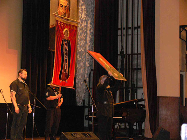 … Потом я начал говорить. – Сегодня некоторые считают, что в Великой Отечественной Войне победил – Русский Народ. По своему – это правильно. Ибо русские своим м у ж е с т в о м и с м е л о с т ь ю принесли ВЕЛИКУЮ ЖЕРТВУ. Но сам народ не может победить в войне без полководца. Без лидера, без с т р а т е г а , без Вождя, направляющего всё движение и ведущего за собой Армию и Страну, народ не может сделать ничего. Таким лидером и стратегом, таким лидером русского Народа и был его Вождь Иосиф Виссарионович Сталин. Зал взорвался аплодисментами. – Сталин, зрелый Сталин был человеком верующим, и именно поэтому мы – Хоругвеносцы – принесли к вам сюда две Хоругви с изображениями на них величайшего создателя Русской Державы СВЯТОГО ПРЕПОДОБНОГО СЕРГИЯ – ИГУМЕНА РАДОНЕЖСКОГО И ВСЕЯ РУСИ, и величайшего борца за чистоту русского Православия и борца с ересью ж и д о в с т в у ю щ и х СВЯТОГО ПРЕПОДОБНОГО ИОСИФА ВОЛОЦКОГО. Они создали и сохранили в силе и чистоте не только нашу святую Русскую Церковь, но и нашу с вами СВЯЩЕННУЮ РОДИНУ – РОССИЮ. И Сталин, разгромив жестокого и сильного врага, несомненно, продолжил их дело. Снова раздались аплодисменты. – Сегодня у нас – русских людей – есть не только такие небесные предстоятели пред Богом как Сергий или Иосиф Волоцкий, и такие великие с и м в о л ы державности и Победы, как Сталин и Жуков, но и такие – прямо скажу – р е л и г и о з н ы е символы ж е р т в е н н о с т и как АЛЕКСАНДР МАТРОСОВ, потому что закрыть своим телом жерло вражеского дзота, так что пулемёт захлебнулся в т в о е й к р о в и , есть прямое исполнение величайшей заповеди Христовой: НЕТ БОЛЬШЕ СИЯ ЛЮБВИ, ЧЕМ КТО ДУШУ СВОЮ ПОЛОЖИТ ЗА ДРУГИ СВОЯ. Но и сегодня, братья и сестры, у нас с вами есть такой же великий с и м в о л Христианской ж е р т в ы . Этот символ есть ВОИН-МУЧЕНИК ЕВГЕНИЙ РОДИОНОВ, которому чеченские бандиты предложили снять Православный Крест, отказаться от Христа и принять Ислам. Тогда ему обещали не только сохранить жизнь, но и сделать их м а с у л ь м а н с к и м б р а т о м , встать в их ряды, получить оружие, деньги, хороший дом и богатство. Он отказался, и не предал ни Святого Креста, ни распятого на нем Господа Бога Иисуса Христа. И этим не предал нас с вами и нашей Родины – России. Вот перед вами его Красная Икона. Красная она потому, что в Православии к р а с н ы й цвет – это цвет м у ч е н и ч е с т в а . И мы – братчики Союза Православных Хоругвеносцев и Союза Православных Братств сегодня просим Вас писать письма в Московскую Патриархию с т р е б о в а н и е м КАНОНИЗАЦИИ ВОИНА-МУЧЕНИКА ЕВГЕНИЯ РОДИОНОВА. Ибо даже чеченцы сами поставили Крест на месте его убиения, и следят за ним, даже президент Чечни Рамзан Кадыров признал, что Евгений был героем, а убившие его – н е г о д я я м и , а мы до сих пор сомневаемся, и ищем какие-то свидетельства, доказательства и обоснования для прославления. Совсем, видно, потеряли совесть и Любовь члены КОМИССИИ ПО КАНОНИЗАЦИИ Русской православной церкви А ведь этому 19-ти летнему мальчику, за то, что ОН НЕ СНЯЛ КРЕСТА, живому – пилой, медленно отпилили голову… И давно уже есть все доказательства. И иконы Воина Евгения мироточат по стране, и вся Православная Святая Русь давно уже почитает его как своего Святого. Народ почитает, а комиссия – сомневается. Видимо, ждут, когда КАМНИ ВОЗОПИЮТ ! Вот и давайте сделаем это. Давайте будем 